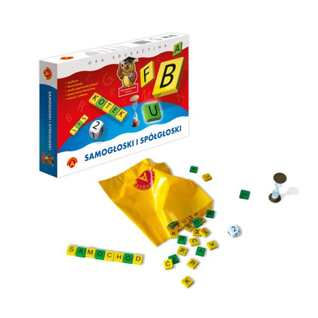 36 tabliczek z samogłoskami, 70 tabliczek ze spółgłoskami, 2 tabliczki joker, klepsydra, worek, kostka, instrukcja.