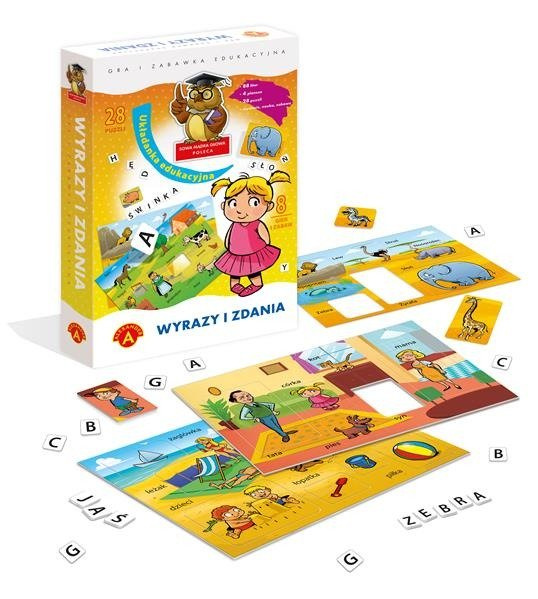 W pudełku znajdują się 4 plansze przedstawiające różne scenki tematyczne. Dzieci podczas zabawy wyciągają z planszy bohaterów obrazka i układają z liter pasujące do nich wyrazy - podpisy. W zależności od umiejętności mogą robić to samodzielnie lub korzystając z podanego na planszy wzoru. To świetny sposób na stopniową naukę rozpoznawania i zapamiętywania liter, układania wyrazów i zdań. Inne warianty gier i zabaw rozwijają spostrzegawczość, koncentracje oraz biegłość w układaniu różnych wyrazów. Dzieci mogą bawić się indywidualnie lub w większym gronie. Dobrze jeśli towarzyszy im opiekun, który wskazuje różne wersje zabawy i pomaga w trudniejszych zadaniach.